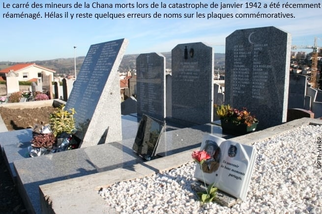 Au fil des exhumations et des regroupements familiaux, cet espace s’est réduit avec aujourd’hui un regroupement des dernières dépouilles et un espace souvenir. Hélas le relevé des noms qui s’y trouvent gravés dans le marbre comporte des doublons et des erreurs. On peut retrouver au musée Jean Marie Somet de Villars un état précis de ce terrible coup de grisou qui fit 65 victimes à la Chana.