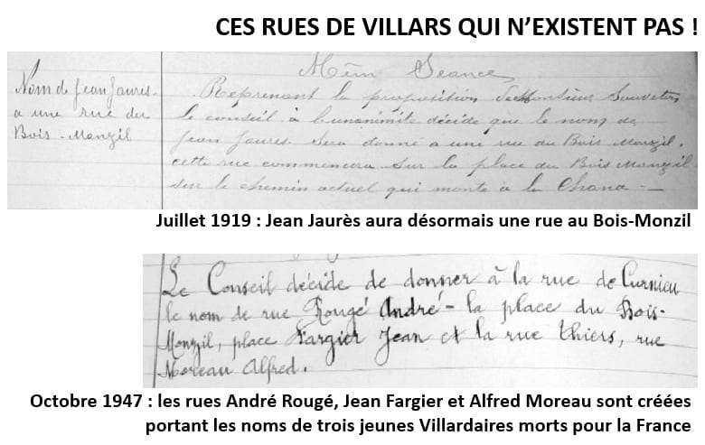 Pour l’anecdote cette délibération a été prise à l’unanimité sur proposition de Camille Souveton, surnommé « Jaurès » à Villars. Mais il y a bien longtemps que la rue Jean Jaurès n’est plus évoquée ni au Bois-Monzil, ni à Villars. Sans que l’on sache pourquoi.