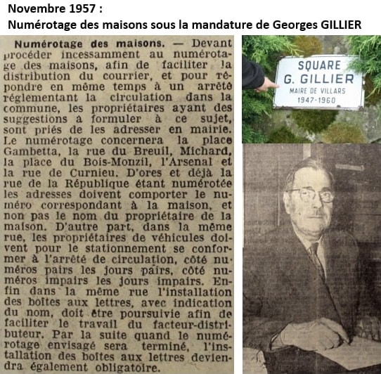 Toujours est-il que c’est en novembre 1957 que la Municipalité alors conduite par le maire Georges GILLIER informe la population de cette décision qui a un double objectif. Il s’agit d’une part de faciliter la distribution du courrier. En plus du numéro sur la maison, il faut également installer des boites aux lettres avec indication des noms des résidents.
