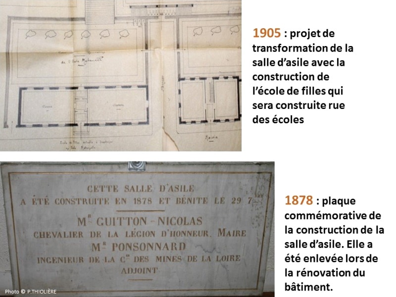 En décembre 1877, le plan de la salle d’asile est approuvé conformément aux observations des bâtiments civils. Le 5 mai 1878 il est procédé à l’adjudication des travaux de construction. Le devis initial s’élève à 16 471 francs. Le Ministère de l’Instruction publique accordera une première subvention de 7000 francs. Il reste aujourd’hui une trace visible de cette édification avec la plaque commémorative placée au-dessus de la porte centrale du bâtiment. On peut y lire : « Cette salle d’asile a été construite en 1878 au moyen des ressources municipales, d’un secours de l’État, à l’aide des dons de la Compagnie des Mines de la Loire et de divers bienfaiteurs » le tout suivi du nom de GUITTON-NICOLAS, chevalier de la Légion d’honneur, maire.